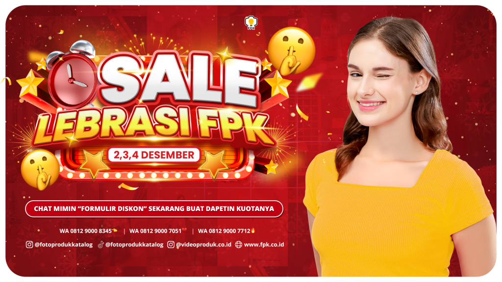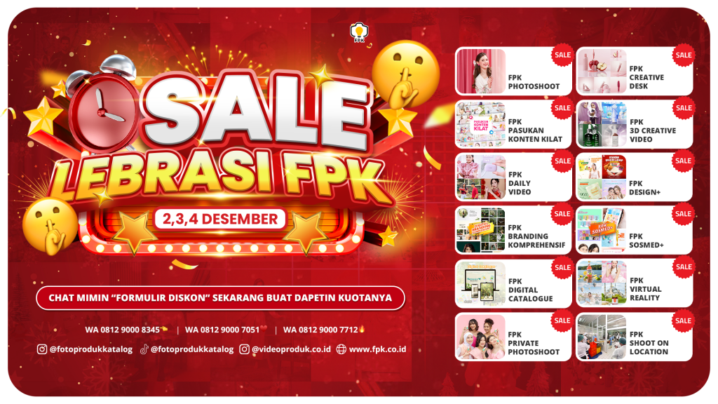 Akhir tahun identik dengan kejar target, penjualan yang makin sengit, dan persaingan visual yang makin ketat. Di saat semua brand berlomba muncul, yang tampil paling konsistenlah yang akhirnya menang. Karena itu, FPK membuka SALE LEBRASI promo besar selama 2, 3, dan 4 Desember untuk hampir semua layanan konten. Hanya 3 hari, hanya untuk yang gerak cepat. Apa Saja yang Ikut SALE? Semua layanan produksi favorit brand owner: